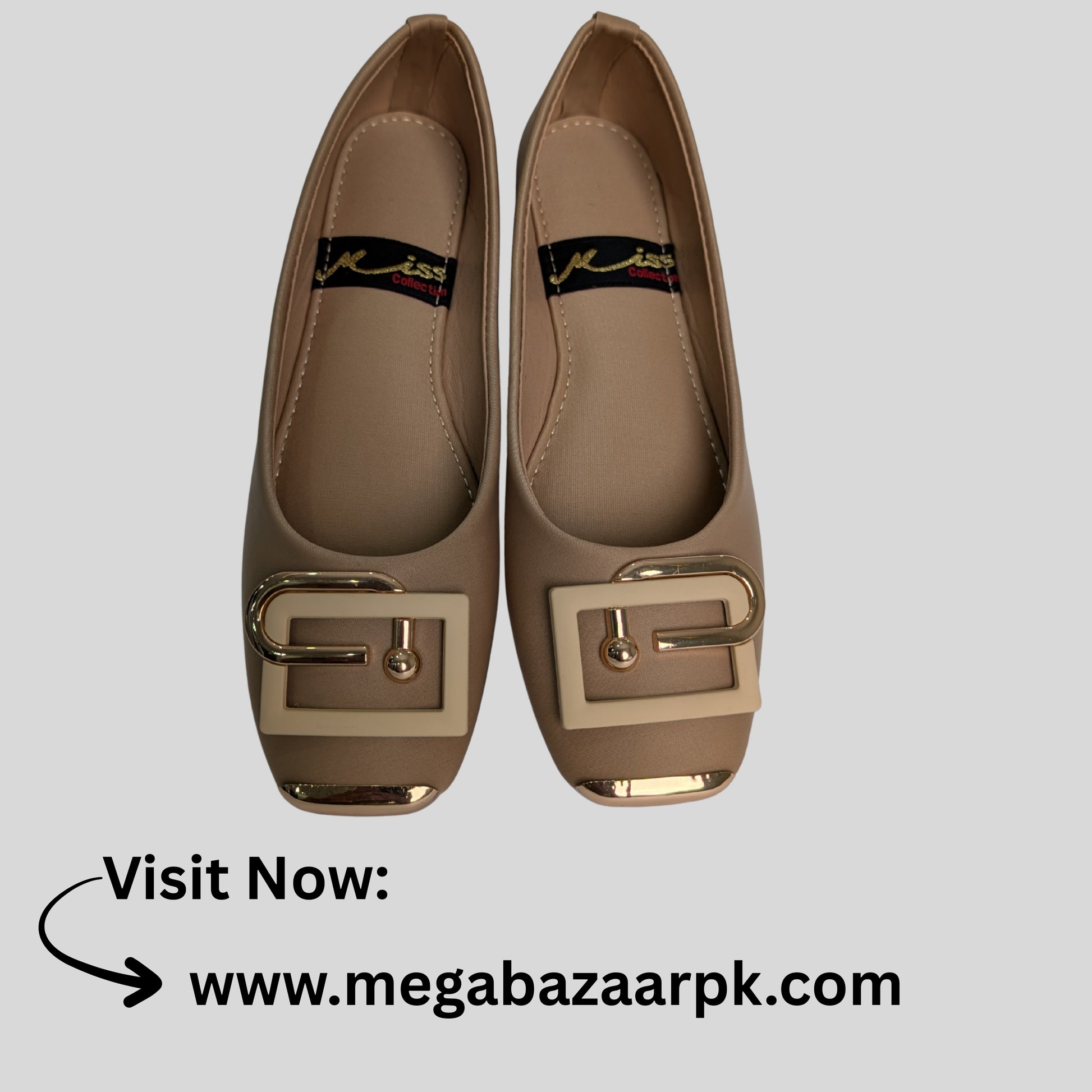 A chic and timeless choice, these beige flats feature a striking gold and cream buckle detail. With a